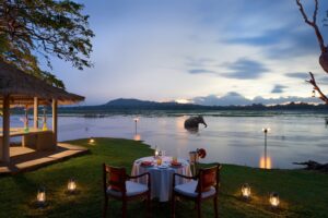 The sunset over the mountainous horizon beyond the lake behind the hotel is a beautiful and peaceful sight each evening. Guests may enjoy a relaxing boat ride on the lake or take a quiet stroll around the resort, soaking in the calm atmosphere and the stunning natural scenery. On occasion, you may even catch a glimpse of a herd of elephants in the distance beyond the lake.